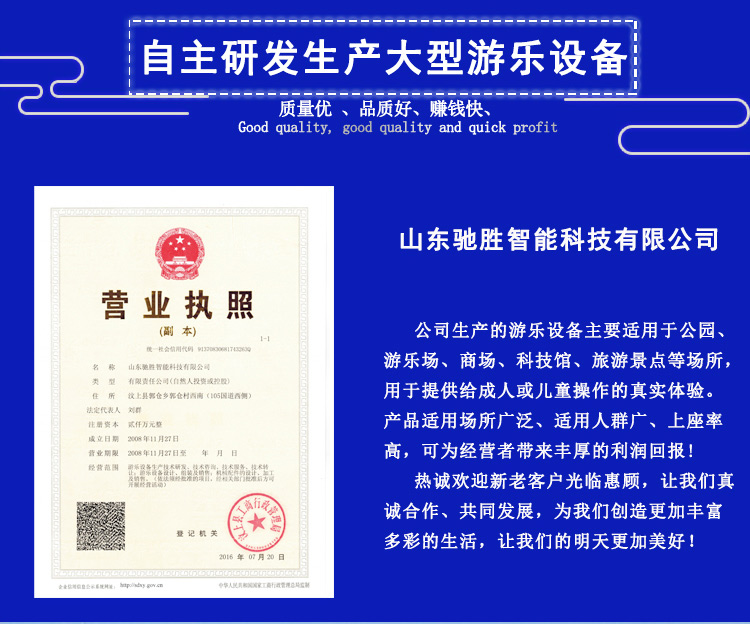 山東馳勝智能科技集團(tuán)有限公司秉承“向遠(yuǎn)方,容世界,敢為先,造歡樂(lè)”的經(jīng)營(yíng)理念-追求和打造景區(qū)游樂(lè)場(chǎng)四季休閑游樂(lè)品牌作為發(fā)展目標(biāo)